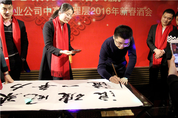 酒會上,雷鳴董事長作了重要講話,向全體中高管理層成員拜年,感謝全體成員一年來為公司發展辛苦的付出與努力,并希望新的一年大家共同努力,讓公司繼續大展宏圖、欣欣向榮。之后,各分公司、事業部、部門紛紛以創新、幽默、多樣的方式向全體參會人員拜年。生產制造中心以喜慶的春聯為依托,在表達新春祝福的同時,還帶來了印有“安全第一 質量為本”字樣的員工集體簽名橫幅,為確保產品質量作出承諾;凈水家電事業部總經理王悅生的現場即興題字,用丹青妙筆表達了其部門成員奮勇爭先的目標和信心;工程事業部總經理劉東帶領其部門成員所采用的“三句半”拜年方式贏得了滿堂喝彩;財務部與企劃部共同合作的“異口同聲”有獎競猜創意拜年,更是傳達了“榮事達一家親”的美好寓意。