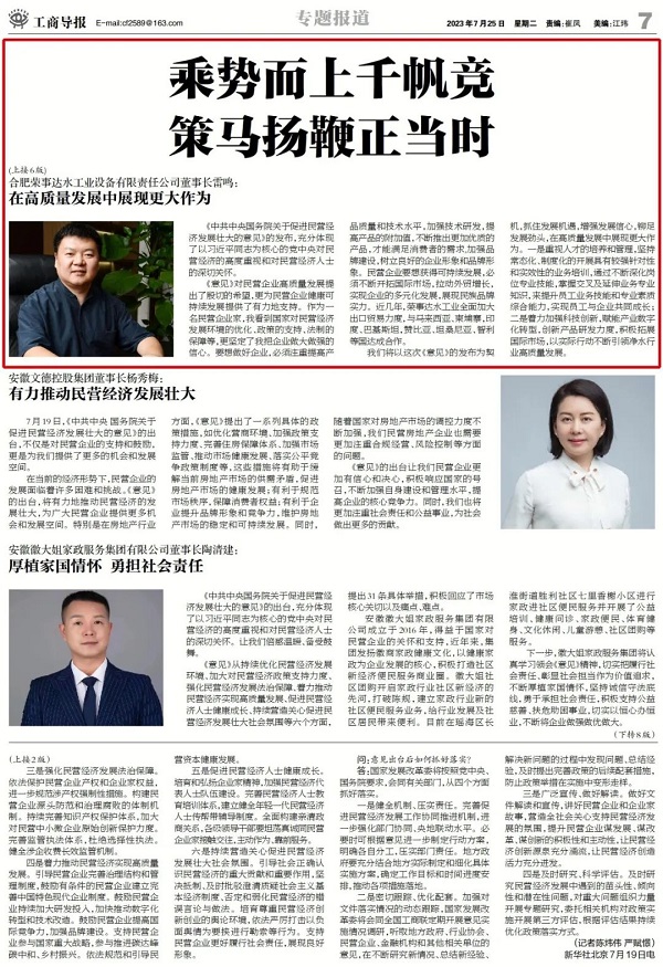 近日,《工商導(dǎo)報》報道了合肥榮事達水工業(yè)設(shè)備有限責(zé)任公司董事長雷鳴關(guān)于《中共中央國務(wù)院關(guān)于促進民營經(jīng)濟發(fā)展壯大的意見》感悟。