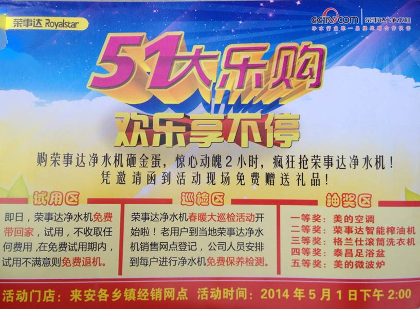 超低折扣購機——五一期間,榮事達推出了一系列購機優(yōu)惠政策,消費者在當?shù)亟?jīng)銷商門店或者小區(qū)推廣點購買榮事達凈水產(chǎn)品,可享受超低折扣。